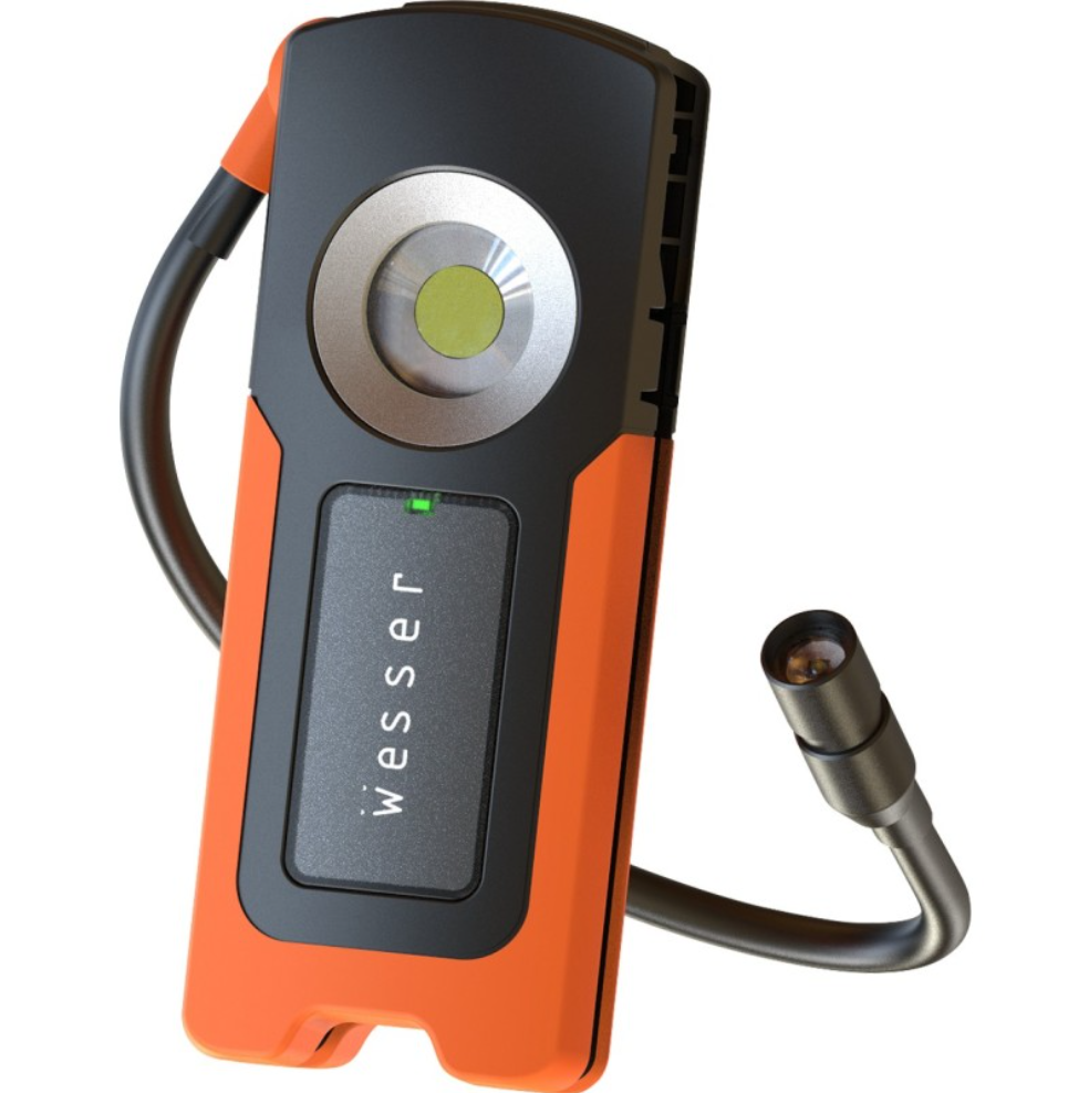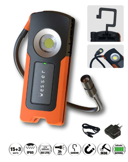 Linterna con luz articulada de 340 mm de longitud, adaptable a cualquier posición (360°), y puede funcionar como soporte.