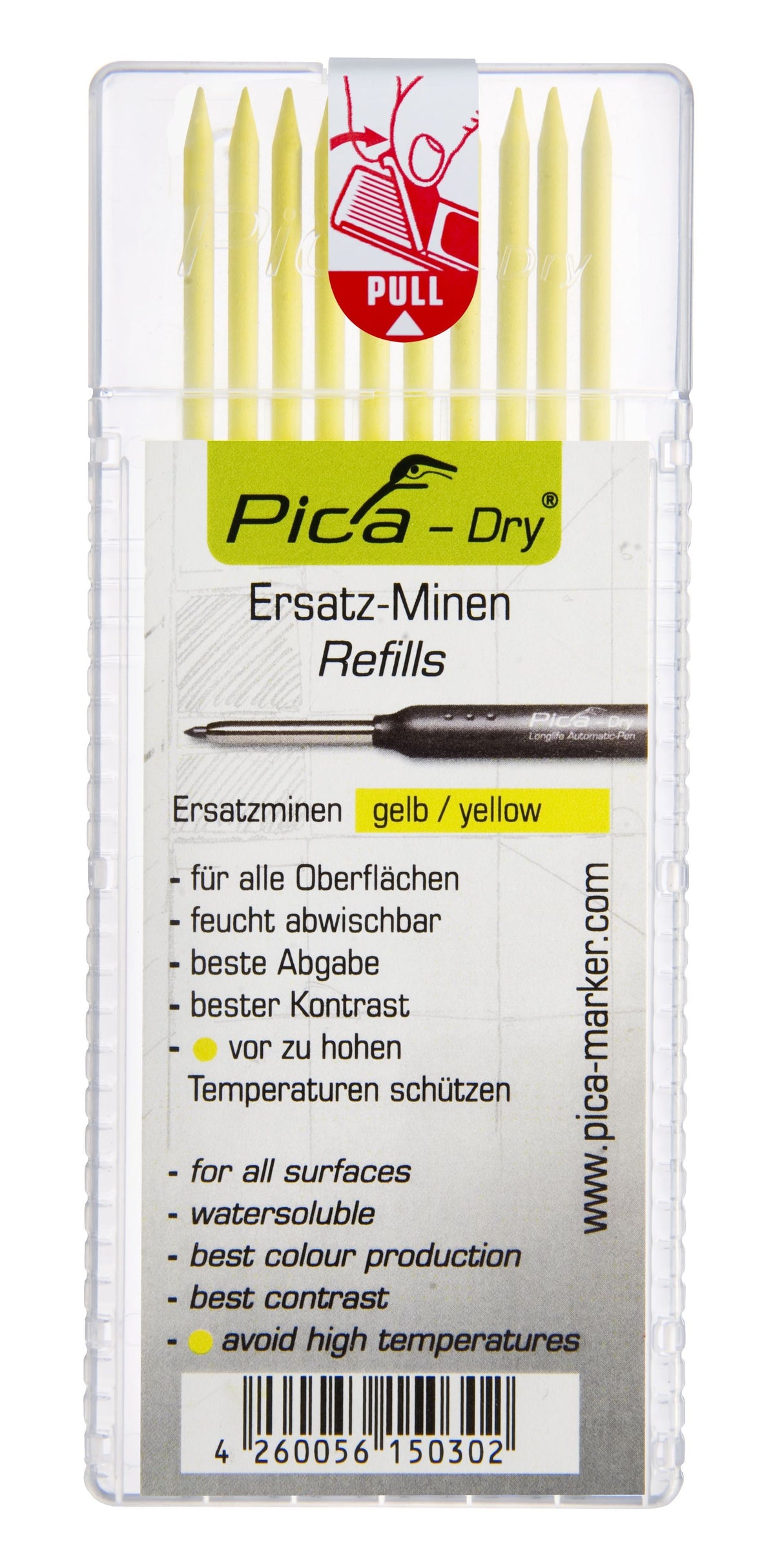 Minas multiuso solubles al aguaPara la mayor parte de superficies, ya sean secas o húmedas, lisas o rugosas, polvorientas o aceitosas, claras u oscurasSe puede eliminar en superficies lisas con un paño húmedoPuntas previamente afiladasEstuche resistenteNo exponer las minas de color rojo y amarillo a temperaturas superiores a 40ºCDisponibles en:Estuches de 10 minas por colorEstuches de 8 minas surtidas: 4 grafito, 2 rojo, 2 amarillo