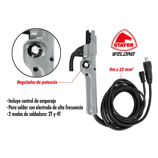 - Incluye portaelectrodos con regulador de potencia y control de alta frecuencia en modos 2T / 4T.