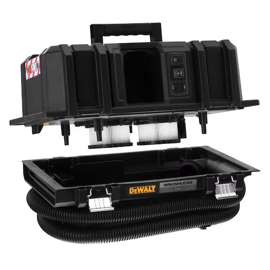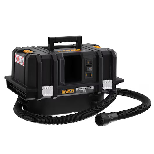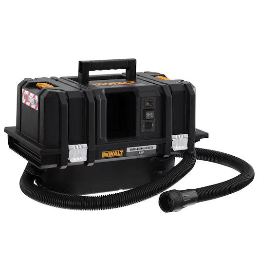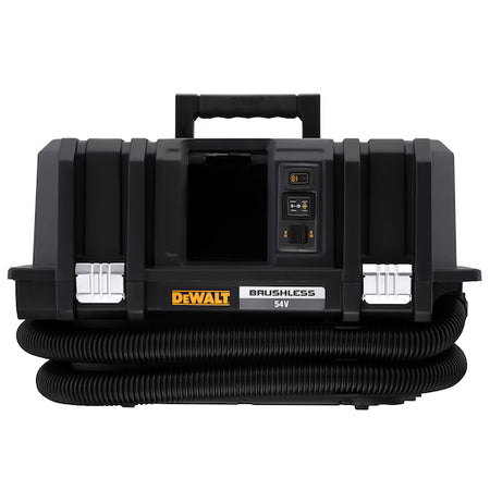 ASPIRADOR SÓLIDOS Y LÍQUIDOS XR FLEXVOLT 54V SIN CARGADOR/BATERÍA. En caja de cartón. Motor sin escobillas que proporciona una potencia equivalente de 2.000W y una protección contra sobrecargas para un mayor rendimiento La activación remota del aspirador se realiza mediante un mando para poderlo encender a distancia, facilitar su uso y ahorrar tiempo Alarma sonora de alerta al usuario si se produce una caída en el rendimiento Certificado clase M, escape de polvo 0.1% a través del filtro, adecuado para su uso en obras Configuración compatible con el sistema TSTAK para una mayor facilidad de uso, mayor movilidad y ahorro de tiempo Limpieza de doble filtro automático cada 30 segundos, reduciendo los problemas de obstrucción del filtro y proporcionando un flujo de aire constante Absorción de líquidos y sólidos para una máxima limpieza e incluye un almacenamiento para la manguera de 2.5m que proporciona una mayor facilidad de uso Resistente al polvo y agua para una máxima protección en condiciones extremas, proporcionando mayor durabilidad Cierres metálicos y resistentes para un acceso rápido y fácil al tanque y a los filtros Plástico de Polipropileno reforzado de 4mm de grosor para una alta resistencia a caídas, proporcionando mayor durabilidad