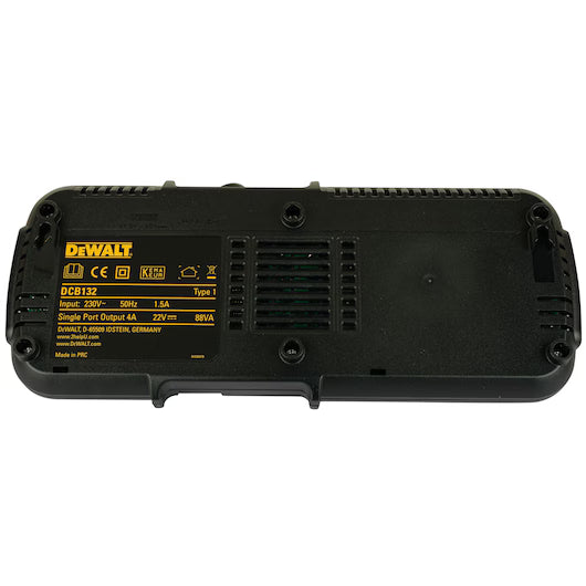 Cargador Doble XR FLEXVOLT: 54V - 18V - 14.4V - 10.8V carril Li-Ion Carga baterías XR Li-Ion de DEWALT de 10.8V, 14.4V, 18V y 54V Cargador con doble puerto que carga simultáneamente a 4A cada una Indicador LED que comunica el estado de la carga de la batería: cargado, carga, problema de energía, y batería demasiado caliente o demasiado fría Posibilidad de montar en pared