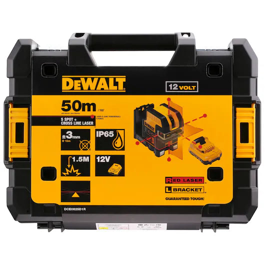 Proyecta dos líneas en cruz+ 5 puntos. Clase 2, autonivelación +/-4°, precisión +/- 3 mm/10m. Proyección de dos líneas en cruz a 90º. Alcance de hasta 30m (sin receptor) y de hasta 50m (con receptor). Incluye batería XR Li-Ion 10,8V 2,0Ah. Báse pivotante mágnetica integrada con rosca de 1/4". IP65/ 2m a prueba de caída. EQUIPO ESTÁNDAR: Batería 10,8V, cargador, soporte de pared, maletín.