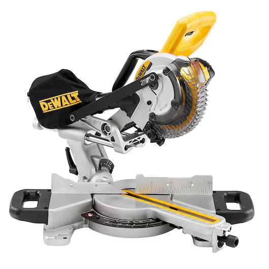 INGLETADORA TELESCÓPICA XR 18V Ø184mm + XPS SIN CARGADOR/BATERÍA. En caja de cartón. Motor de doble aislamiento de 65mm refrigerado por ventilador con escobillas reemplazables que ofrece una potencia máxima para cortar madera dura Sistema de ajuste de los ángulos de inglete que ofrece una extraordinaria precisión y un consistente ajuste de los ángulos entre 0° y 48° a la derecha y entre 0° y 48° a la izquierda El mecanismo de doble guía telescópica ofrece un soporte máximo para realizar cortes de materiales de gran tamaño en cualquier ángulo de inglete o bisel Las disposiciones de los railes guía en posición horizontal ofrece mayor capacidad de corte para cortar materiales grandes La base es de aluminio para ofrecer una gran estabilidad a la ingletadora sin perjudicar en ningún momento su facilidad de transporte Las paradas positivas tanto para hacer ingletes como para biselar permite preparar rápidamente y de forma fácil el ángulo de corte a realizar La innovadora línea indicadora del corte con sombra XPS proporciona la alineación exacta y rápida de la lámina mientras que ilumina la pieza del trabajo para aumentar la productividad
