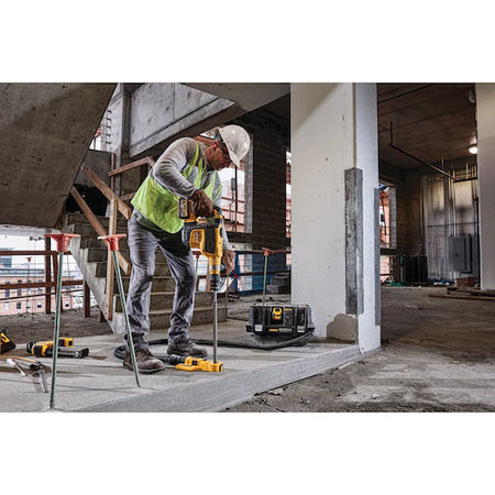 MARTILLO ELECTRONEUMÁTICO SIN ESCOBILLAS SDS-Max XR FLEXVOLT 54V 2 MODOS 10.5J SIN CARGADOR/BATERÍA. Con maletín El verdadero rendimiento de las herramientas con cable Sistema Anti-Rotación que detecta una pérdida de control de la herramienta y reacciona cortando instantáneamente la electricidad Motor con tecnología sin escobillas proporciona mayor autonomía y durabilidad Control electrónico de velocidad variable y control de energía impacto Opción de activación y sincronización de Mando a distancia que permite vincular la herramienta con el Aspirador XR FLEXVOLT Perform & Protect: La menor vibración 8.8 m/s² que reduce la fatiga del usuario Ideal para perforaciones de anclajes y agujeros de fijación en hormigón, ladrillo y mampostería hasta 45mm Martillo de diseño ergonómico y compacto que ofrece un mayor control y acceso a zonas difíciles. Indicador de reparación