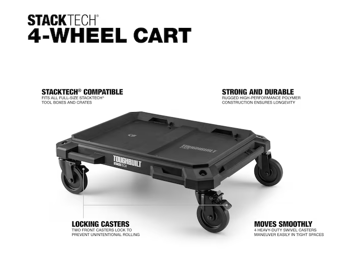 El carrito de 4 ruedas StackTech es una solución conveniente para transportar sus cajas de herramientas StackTech con facilidad. El carrito cuenta con cuatro ruedas giratorias de goma dura de 3,9″ de alta resistencia que se pueden mover sin esfuerzo por espacios reducidos. Para mayor estabilidad, las dos ruedas delanteras están equipadas con mecanismos de bloqueo que garantizan que el carrito se mantenga firmemente en su lugar durante la carga, descarga o cuando está parado para evitar que se mueva involuntariamente. El carrito está diseñado específicamente para cajas de herramientas y organizadores StackTech, por lo que se bloquean automáticamente en su lugar cuando se apilan en el carrito. Fabricado con polímero duradero de alto rendimiento, este carrito está diseñado para soportar los rigores del uso diario en entornos exigentes. También tiene puntos de amarre integrados para anclar las correas de forma segura. Mueva cómodamente sus cajas de herramientas o estación de trabajo StackTech de un trabajo a otro con el carrito de 4 ruedas StackTech.
