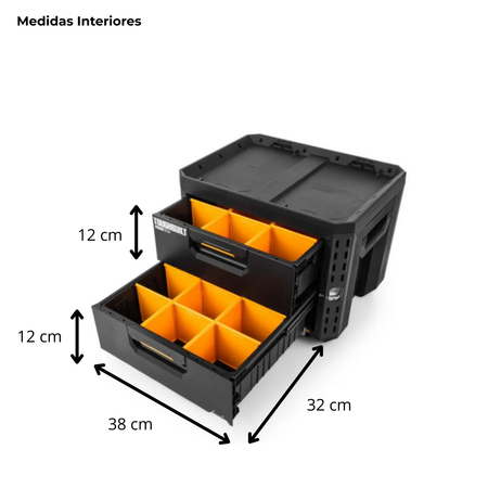 ¿Qué dimensiones tienen los cajones por dentro? Cada uno de los dos cajones tiene un espacio útil de 38 cm de ancho, 32 cm de profundidad y 12 cm de altura, lo que permite guardar herramientas eléctricas medianas con total comodidad.
